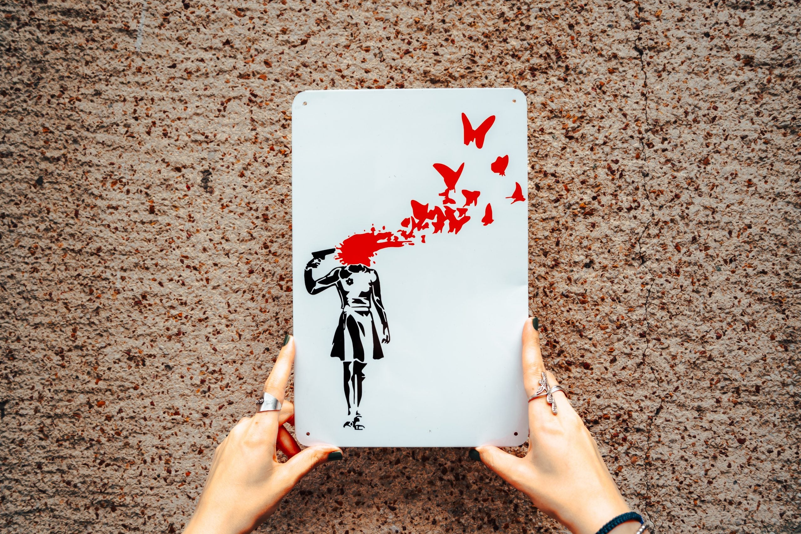 Jedes Stück wurde mit Präzision und Hingabe aus hochwertigem Metall gefertigt. Durch kunstvolles Design und meisterhafte Handwerkskunst gelingt es, die Essenz von Banksys kreativem Genie einzufangen. Diese Wanddekorationen sind eine Hommage an seinen rebellischen Geist und seine einzigartige Herangehensweise an die Kunst.