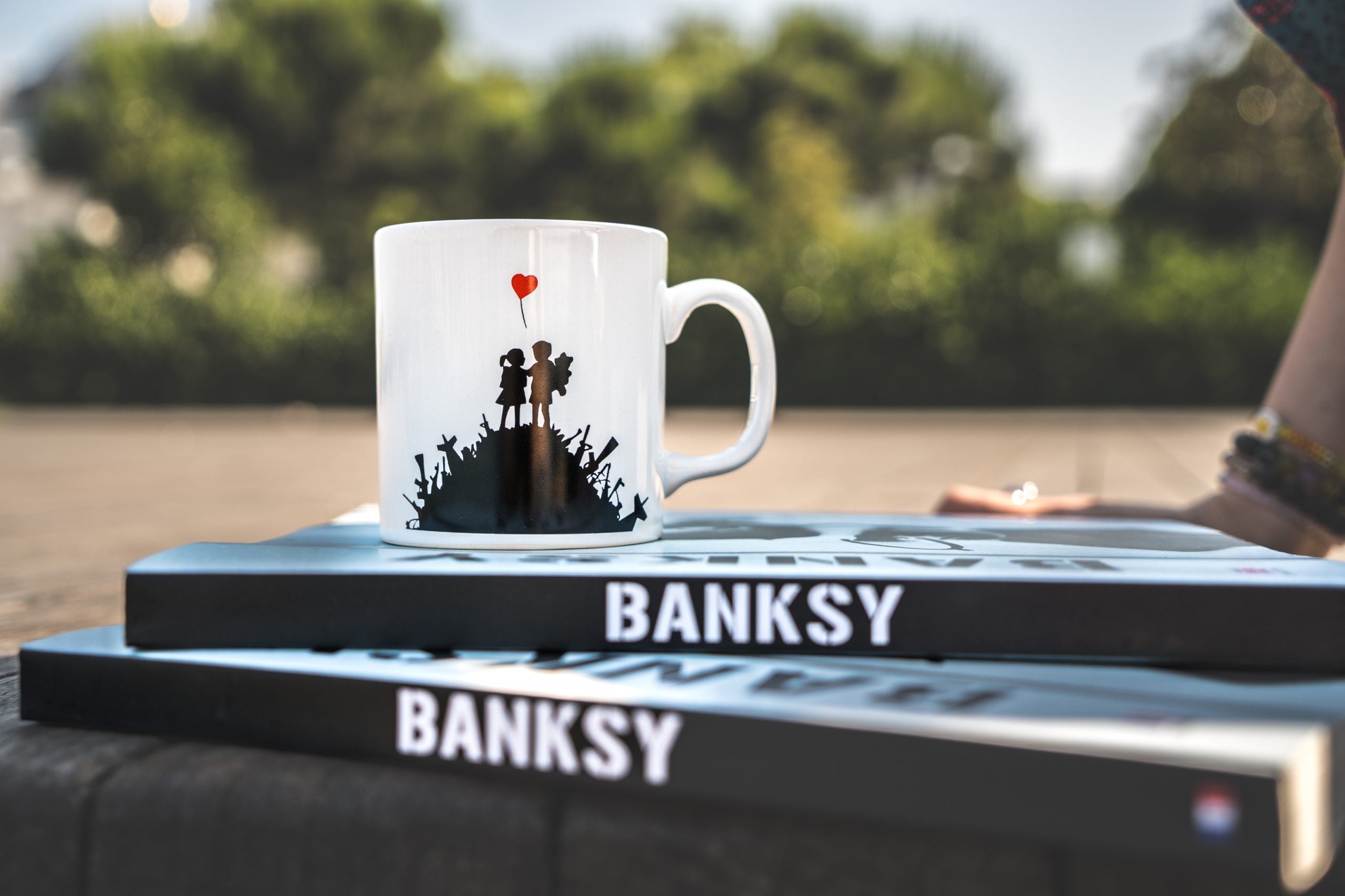Die außergewöhnliche Welt des provokativen Künstlers Banksy erwacht nun auf Ihren Keramikbechern zum Leben! Jeder Becher wurde mit einem einzigartigen Spiegelbild von Banksys mysteriöser und kontroverser Kunst gestaltet. Die Spuren, die Banksy auf den Straßen und Wänden hinterlassen hat, verschmelzen auf diesen Bechern zu einer originellen Darstellung.