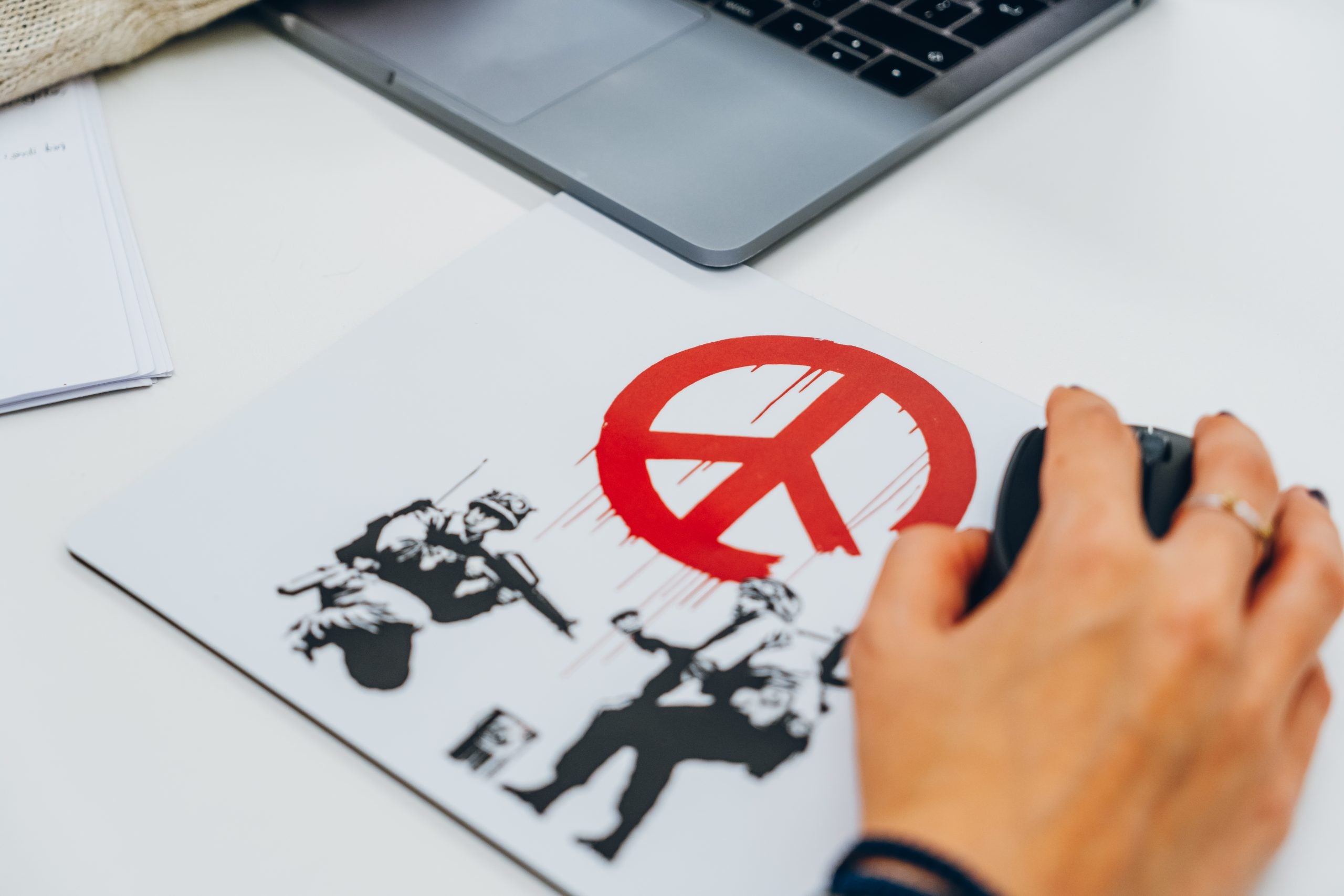 Unsere Mauspads mit Banksys ikonischem Kunstwerk sind eine Hommage an seine künstlerische Vision und bieten gleichzeitig eine hochwertige Oberfläche für die präzise Navigation auf Ihrem Computer. Bringen Sie einen Hauch von Street Art und Kreativität in Ihren Computeralltag mit unseren rutschfesten Mauspads mit Banksy-Kunstdrucken.