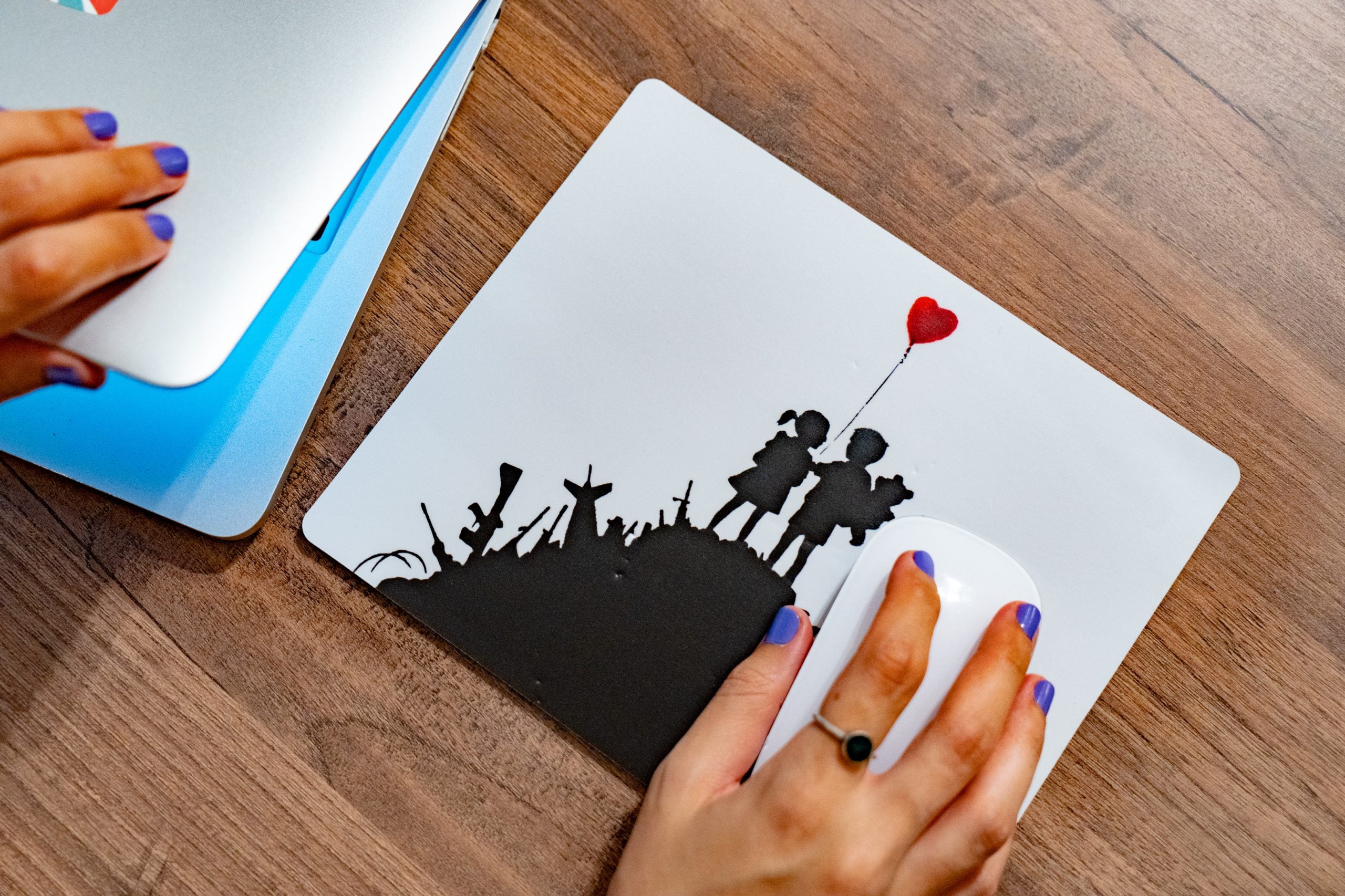Unsere Mauspads mit Banksys ikonischem Kunstwerk sind eine Hommage an seine künstlerische Vision und bieten gleichzeitig eine hochwertige Oberfläche für die präzise Navigation auf Ihrem Computer. Bringen Sie einen Hauch von Street Art und Kreativität in Ihren Computeralltag mit unseren rutschfesten Mauspads mit Banksy-Kunstdrucken.
