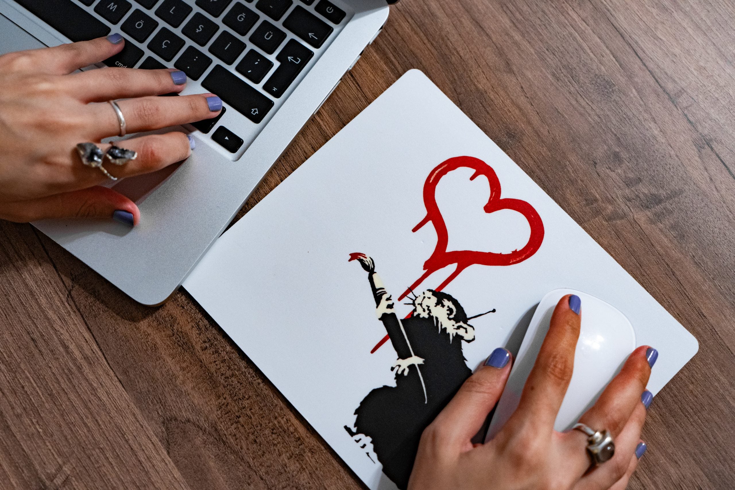 Unsere Mauspads mit Banksys ikonischem Kunstwerk sind eine Hommage an seine künstlerische Vision und bieten gleichzeitig eine hochwertige Oberfläche für die präzise Navigation auf Ihrem Computer. Bringen Sie einen Hauch von Street Art und Kreativität in Ihren Computeralltag mit unseren rutschfesten Mauspads mit Banksy-Kunstdrucken.