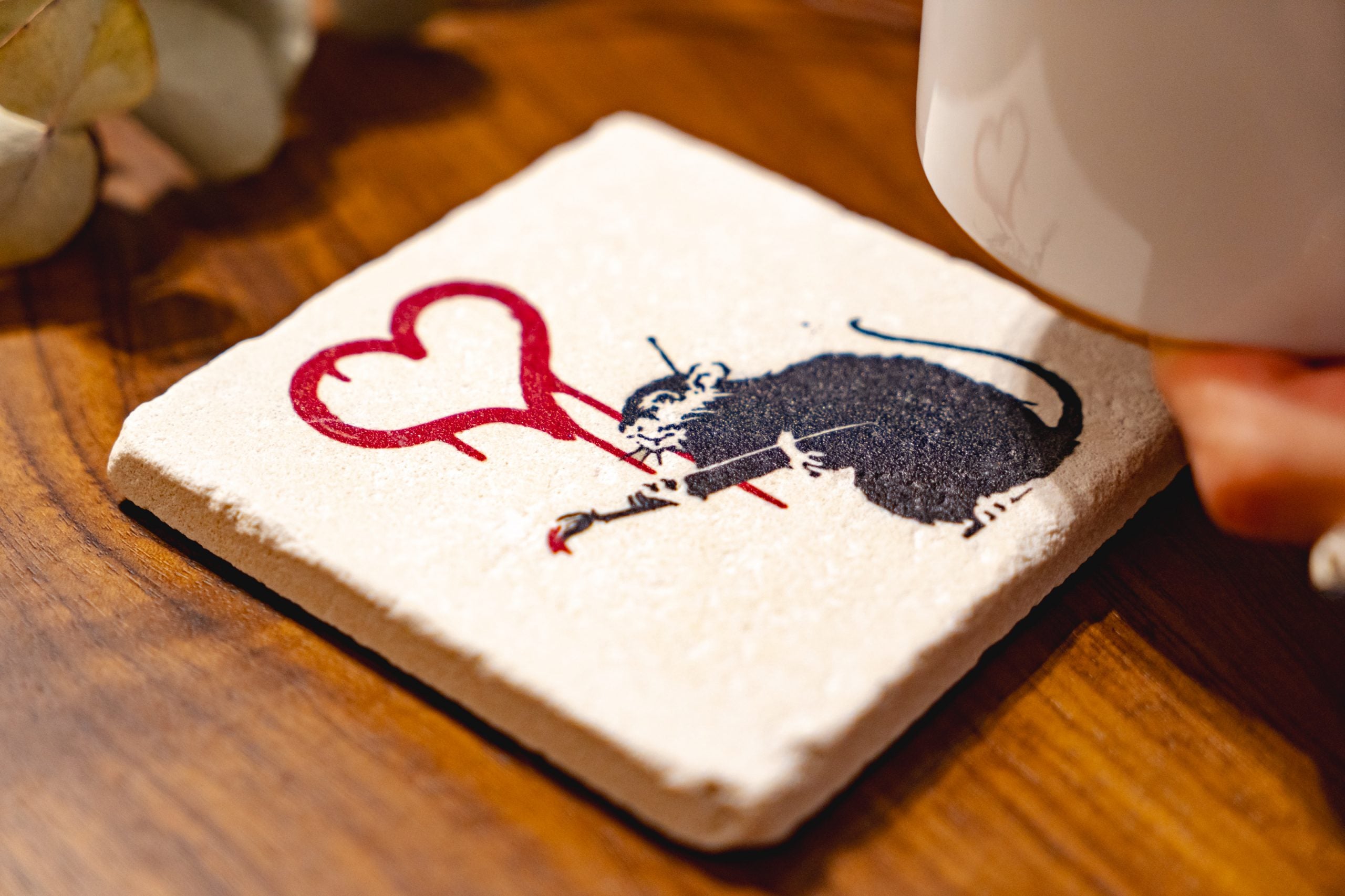 Diese Untersetzer sind aus hochwertigem, strapazierfähigem Material gefertigt, das gegen Flüssigkeit und Flecken beständig ist. Sie bieten eine praktische und ästhetische Lösung. Wenn Sie Farbe in Ihr Zuhause oder Büro bringen und gleichzeitig eine starke künstlerische Aussage teilen möchten, dann sind diese Untersetzer eine hervorragende Wahl.